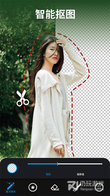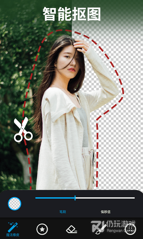 • AI智能识别照片中的人物,删除背景图和切割多余图像。手动处理图片细节部分,让你享受编辑图片的乐趣,瞬间变身照片处理达人而无需photoshop,手机版PS软件,大神是你专属的抠图软件哦