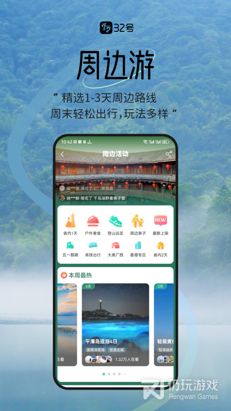 32号是覆盖了各种旅游方式的服务平台。这里每周都会为会员推荐周边的旅游项目,组织各种轻户外的活动,让你可以在周末的时候放松自己的身心,洗涤一周的疲惫。还为各种团体提供非常个性化的定制服务,让大家可以充分享受旅游的欢乐。
