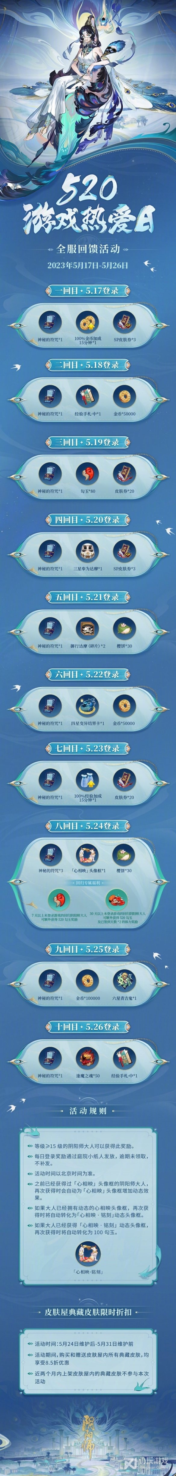 ※5月17日维护后-5月26日23:59,所有等级≥15级的大人,每日登录游戏即可查收来自不同式神的信件,领取520回馈赠礼,包括专属头像框、神秘的符咒、御行达摩碎片等。