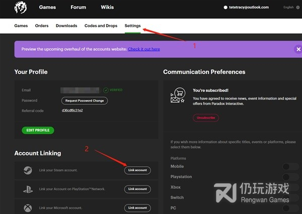 进入P社官网-选择settings-选择link account即可,没有P社账号的朋友往下看注册教程哦~