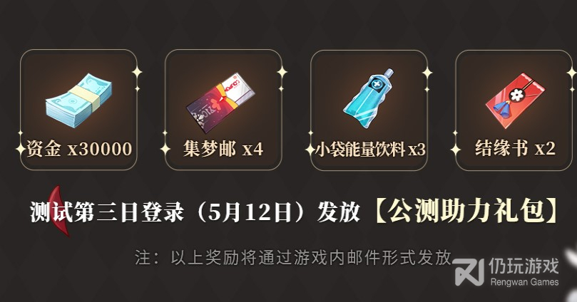 测试第三日(5月12日)登录可得公测助力礼包,礼包内含4张集梦邮。