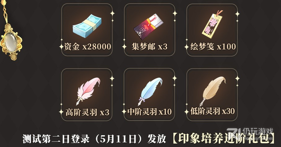 测试第二日(5月11日)登录可得印象培养进阶礼包,礼包内含3张集梦邮。