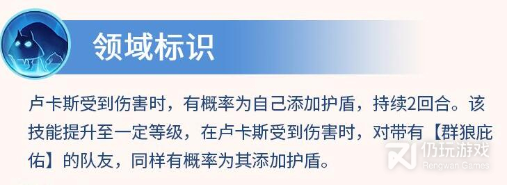 2技能【领域标识】可以在卢卡斯受到伤害时,为自身添加护盾,同时还会对带有狼群庇佑效果的己方队友添加护盾。