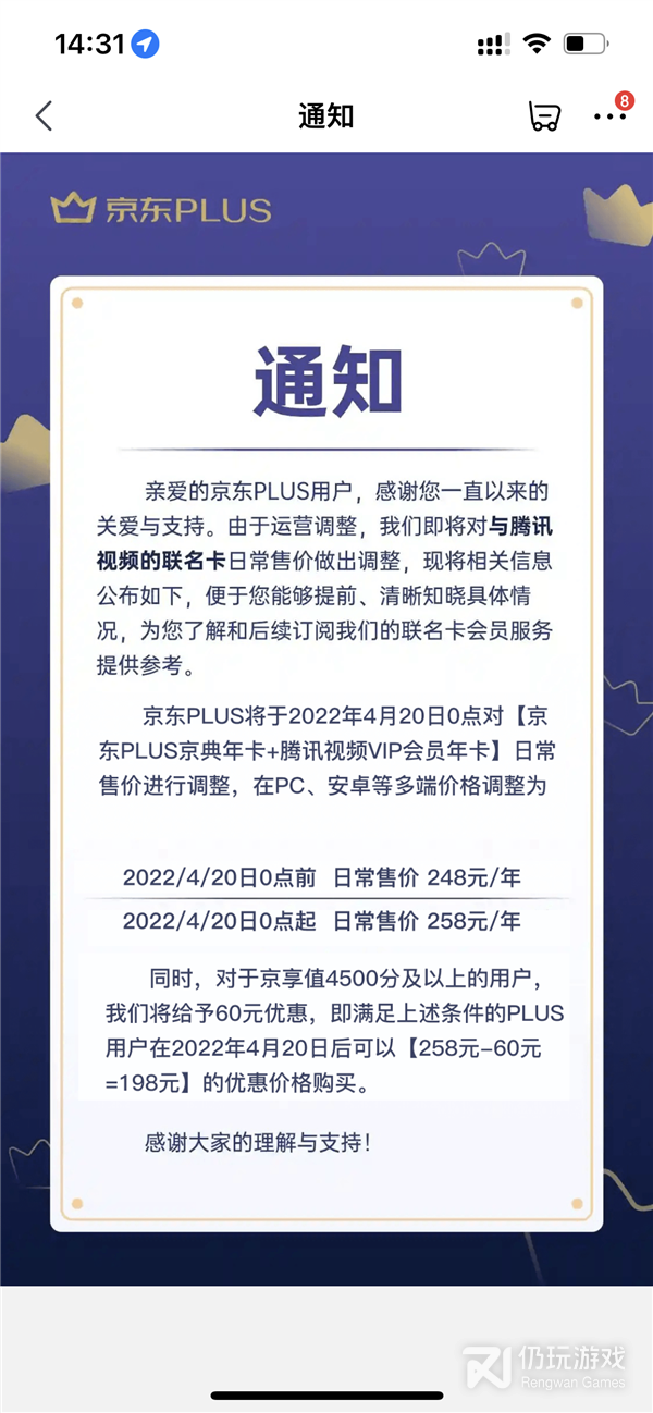 《京东》官方表示,京东PLUS将于2022年4月20日0点对“京东PLUS京典年卡+腾讯视频VIP会员年卡”日常售价进行调整,会员Plus价格一年258元,上调了10元。